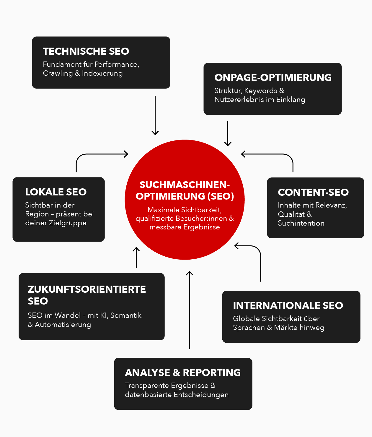 Jedes Unternehmen ist einzigartig – deshalb entwickeln wir keine Standardlösungen. Unser interdisziplinäres Team deckt alle Bereiche der Suchmaschinenoptimierung ab: von technischer SEO über On- und Offpage-Optimierung bis hin zu Content-Marketing, Linkaufbau und Reporting. Ob Start-up, Mittelstand oder Konzern – wir passen unsere Strategien individuell an deine Anforderungen an und schöpfen dein SEO-Potenzial vollständig aus.