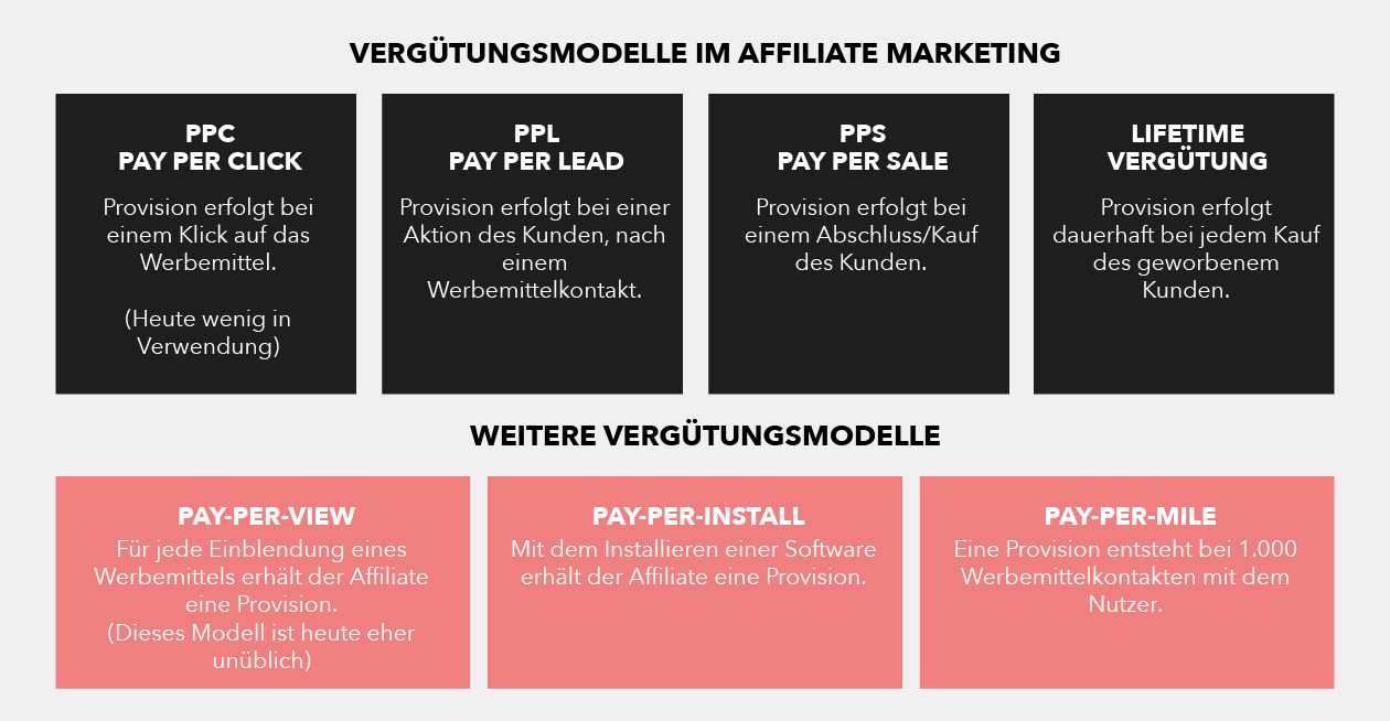 Eine Provision kann auf unterschiedliche Art und Weise berechnet werden. Während einige bereits eine Provision erstatten, sobald jemand auf den Link klickt, muss es bei anderen zu einem qualifizierten Kundenkontakt, einem sogenannten Lead kommen. Wieder andere zahlen nur dann eine Provision, wenn ein Nutzer ein Produkt kauft oder eine Dienstleistung beansprucht. Man spricht hierbei von sogenannten Provisionsmodellen, auf welche sich Affiliateprogramme stützen. Sie werden folgendermaßen unterteilt: