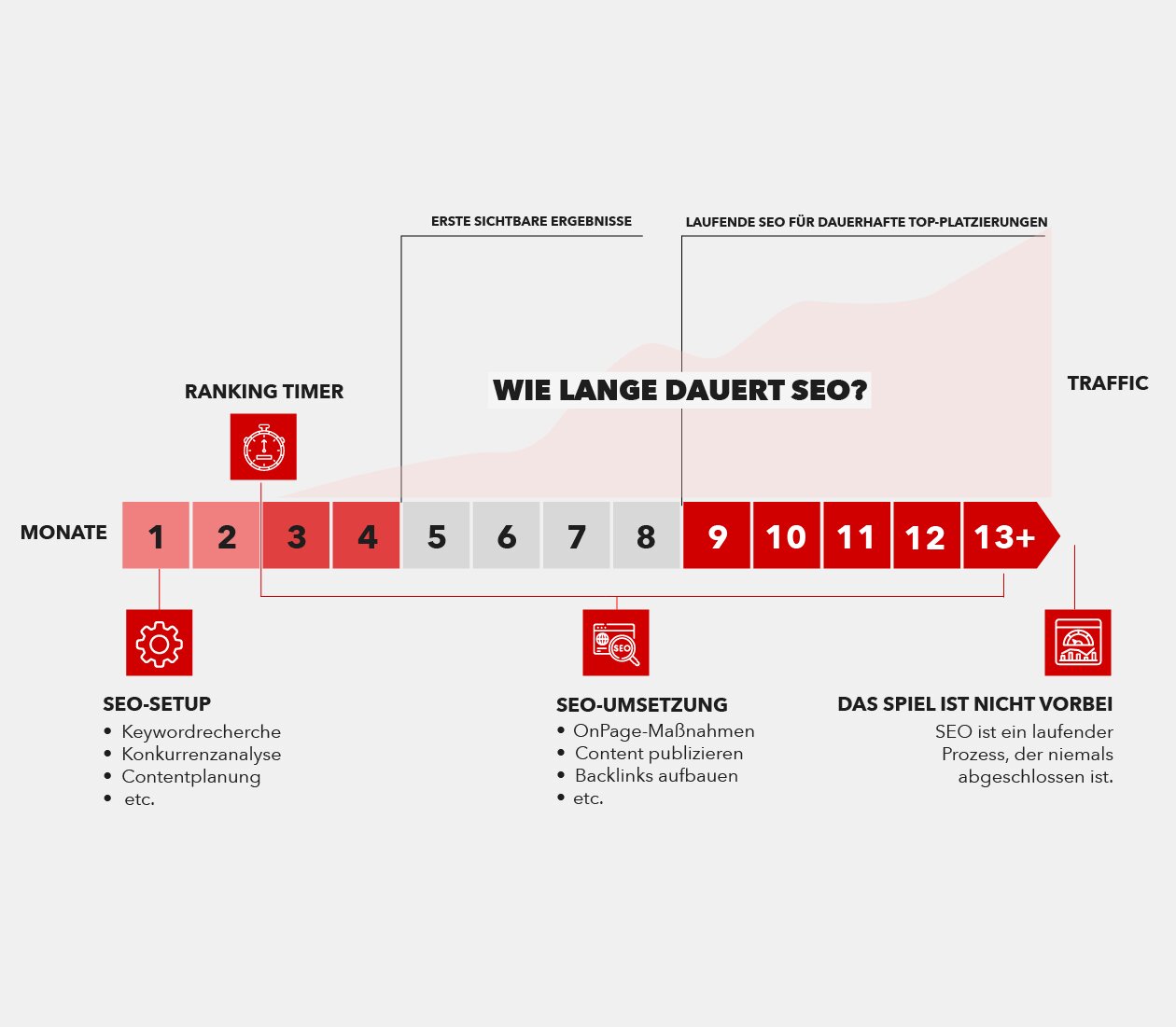 Weil SEO ein strategischer Prozess ist, braucht es etwas Geduld. Große Fortschritte wie eine höhere Sichtbarkeit oder mehr Klicks zeigen sich meist nach 2 bis 4 Monaten. Diese Zeit braucht es, um nachhaltige Rankings und stabile Besucherzahlen zu erreichen. Wichtig ist: Konstanz schlägt Tempo. Wir setzen auf eine transparente Planung, klären dich über jeden Fortschritt auf und begleiten dich als SEO-Firma in Düsseldorf die ganze Zeit über.