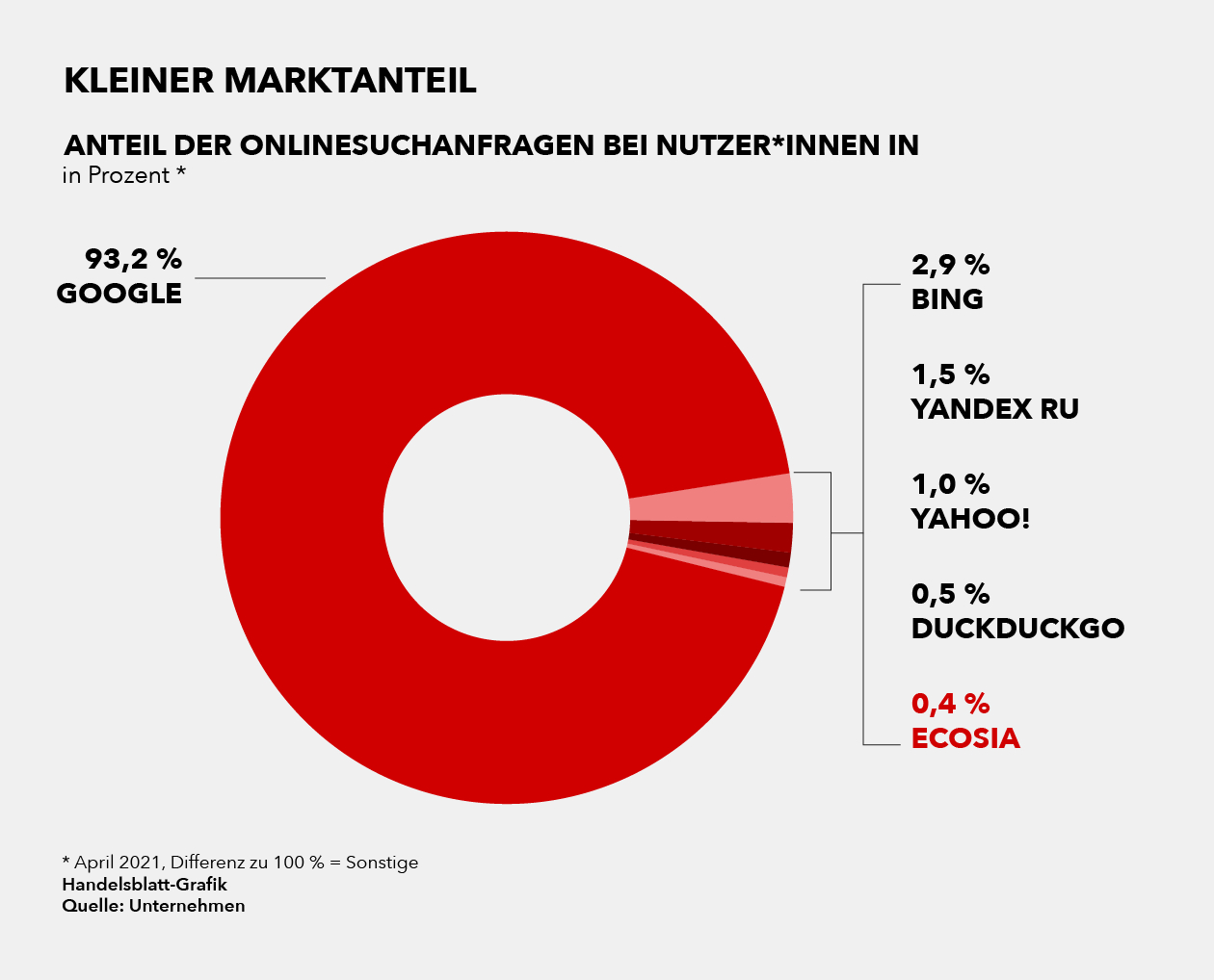 Das Unternehmen zeigt zudem, wie viel Geld es in den kleinen Märkten seines Suchmaschinengeschäfts verdienen kann. In Deutschland erklärt Ecosia, einen Marktanteil von über einem Prozent zu haben, in den USA etwas weniger. Laut einer europäischen Analyse lag dieser Anteil weltweit bei insgesamt 0,37 Prozent. Ecosia kann dank der Technologie von Microsoft mit einem vergleichsweisen geringen Aufwand verwaltet werden. Mit über 70 Mitarbeitenden gab das Unternehmen im März 2021 ca. 73.000 € für Server und Software und mehr als 381.000 € für Personalkosten aus. Insgesamt stellt Ecosia sicher, dass wirklich stets 80 Prozent der Einnahmen in Projekte reinvestiert werden und schlüsselt in der monatlichen Bilanz genau auf, an welche Länder, bzw. Projekte diese Zuwendungen gegangen sind. Im März 2021 ist zum Beispiel mit einem Anteil von 260.927 € das meiste Geld nach Indien investiert worden. Diese Transparenz nach außen steht sinnbildlich für die gesamte Unternehmensphilosophie – es geht um stets um das Thema Verantwortung, intern sowie extern, zu übernehmen.