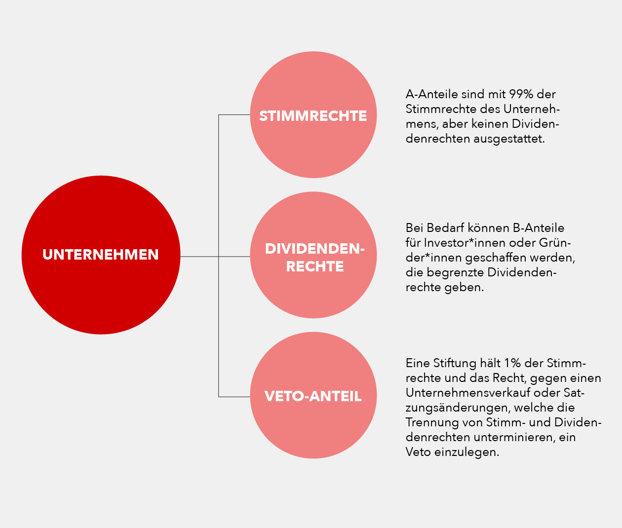Konkret bedeutet dies für Ecosia: Kroll und sein Partner halten zwar 99 Prozent der Stimm-, aber keine Dividendenrechte. 1 Prozent liegt bei der Purpose Stiftung, welche dadurch gleichzeitig ein Veto-Stimmrecht erhält. Insgesamt sind aber 99 Prozent der Firmenanteile in die Stiftung übertragen worden, welche das zweckmäßige Handeln des Unternehmens auch nach Ausscheiden der Gründer sicherstellt.