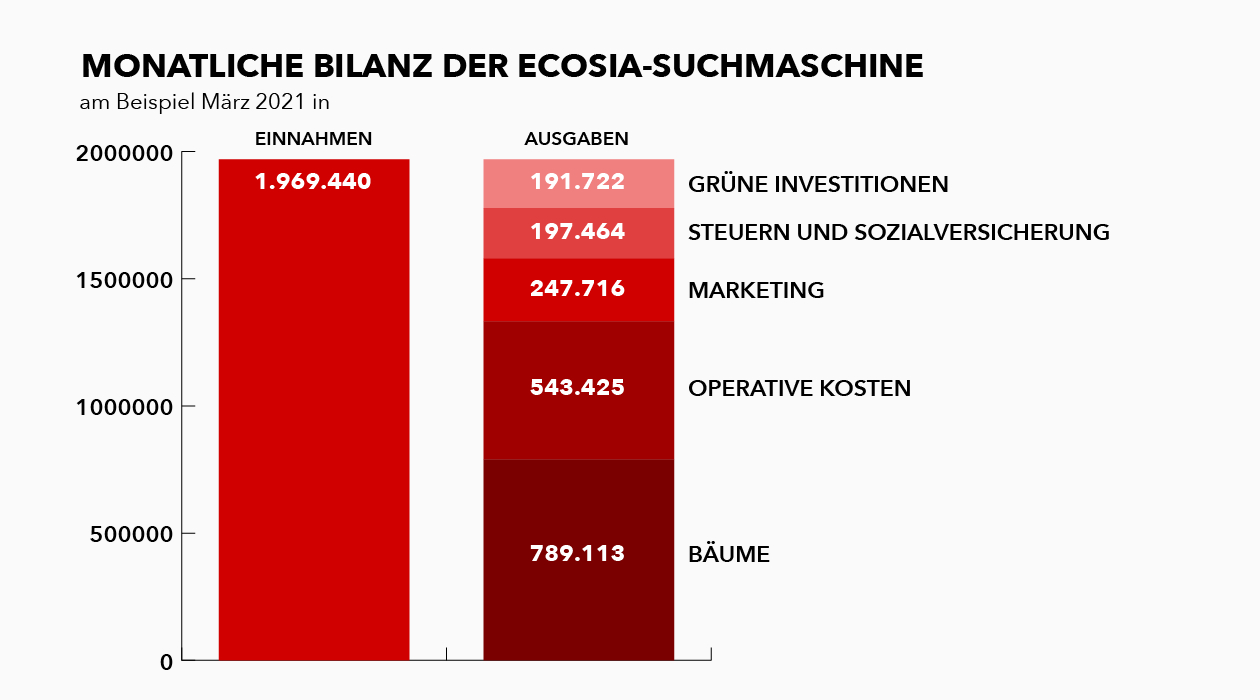 Ecosia veröffentlich selbst, um seinen Nutzern Transparenz zu liefern, einen monatlichen Finanzreport. Laut des aktuellen Finanzberichts aus März 2021 teilten sich Einnahmen und Kosten wie folgt auf: