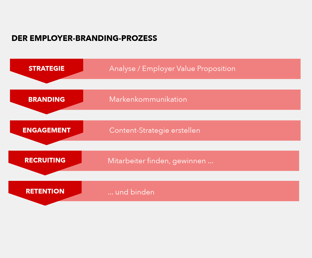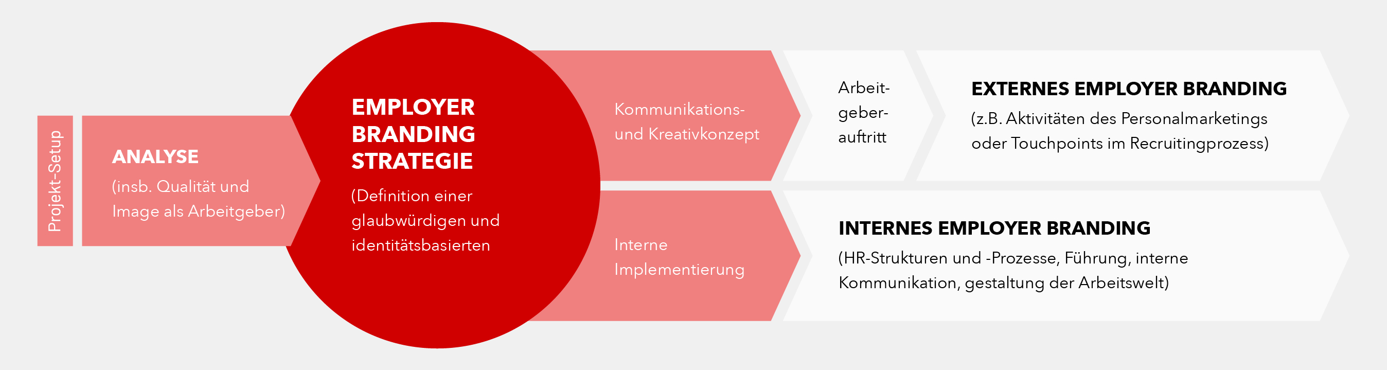 Neben reiner „Werbung“ für das Unternehmen als Arbeitgeber sollten die Vorteile durch umfassende Maßnahmen auch in die Realität umgesetzt werden. Um all dies zu erreichen, wird eine Employer Branding Strategie entwickelt, in welcher das Unternehmen zunächst genauestens analysiert wird. Daraufhin werden Maßnahmen für Recruiting- und Retention-Prozesse geplant und durchgeführt.