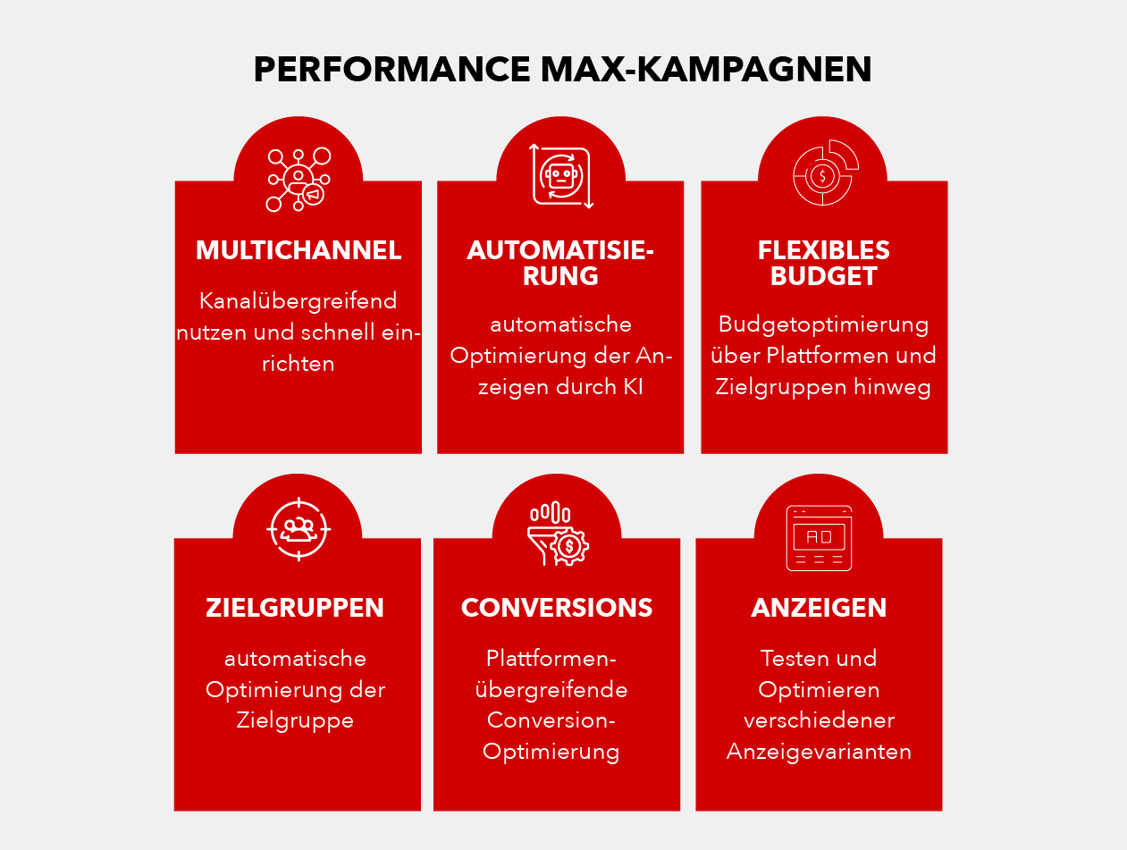 Google Max-Performance ist eine KI-gestützte Kampagnenart in Google Ads. Sie kombiniert bereitgestellte Texte, Bilder und Videos zu Anzeigenformaten und spielt sie automatisch über Suche, YouTube, Display, Gmail, Discover und Maps aus. Ziel ist es, bestmögliche Google Ads-Ergebnisse zu erzielen.