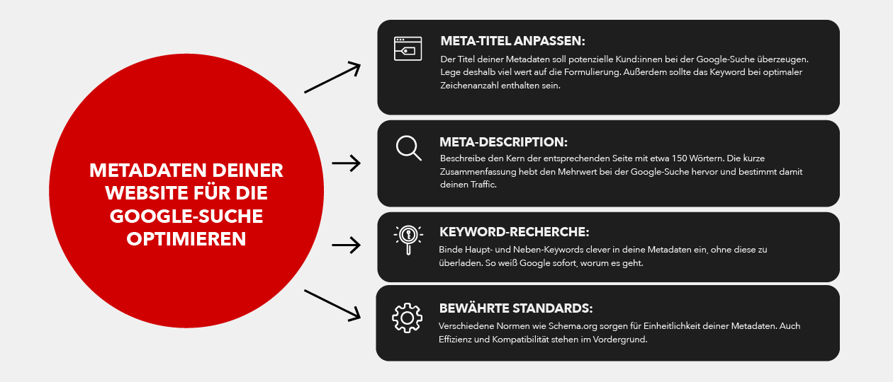 Bei der Google-SERP treffen Suchende immer zuerst auf eine Liste aus Metadaten. Anhand der aufgelisteten Meta-Titel und Meta-Descriptions fällt es ihnen leichter, sich bei der Google-Suche für oder gegen eine Website zu entscheiden. Wer gutes Metadaten-Management zu seiner Passion macht, kann die Klickrate eigener Seiten deutlich steigern. Wir SUCHHELDEN optimieren in diesem Bereich gezielt mit Fokus-Keywords und einer klaren Struktur. Für Google und potenzielle Kund:innen gilt es, relevant und ansprechend zu sein. Dann steht einem schnellen Einstieg mit mehr Traffic und Leads nichts im Weg.
