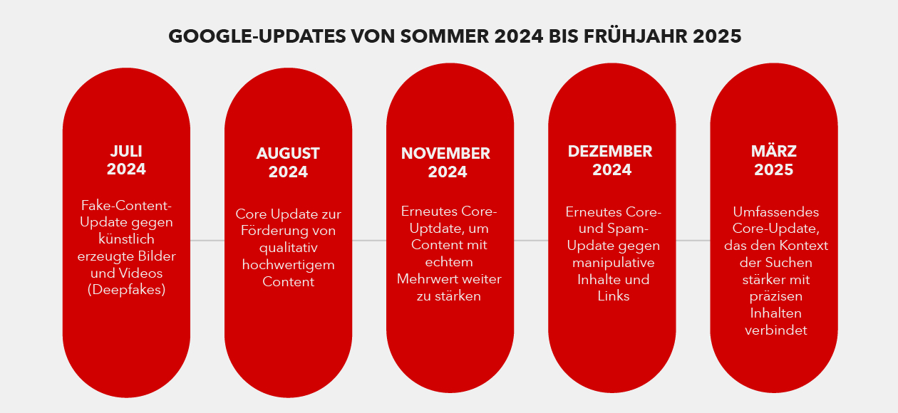 Google-Updates verändern regelmäßig, wie Inhalte bewertet und gerankt werden. Nicht immer legt das US-amerikanische Unternehmen seine Anpassungen konkret offen. Deshalb müssen SEO-Expert:innen ein Auge darauf haben. Besonders sogenannte Core-Updates haben spürbare Auswirkungen auf Sichtbarkeit und das Ranking von Websites bei der Google-Suche. Wer jedoch über starke Inhalte mit echtem Mehrwert, guter Struktur und technischer Sauberkeit verfügt, lässt sich durch dadurch nicht so schnell aus der Bahn werfen. Optimierungen und neue Strategien sind meist trotzdem sinnvoll, um Google-SEO gemeinsam mit dem Algorithmus weiterzuentwickeln – nachhaltig, datengestützt und suchmaschinenkonform.