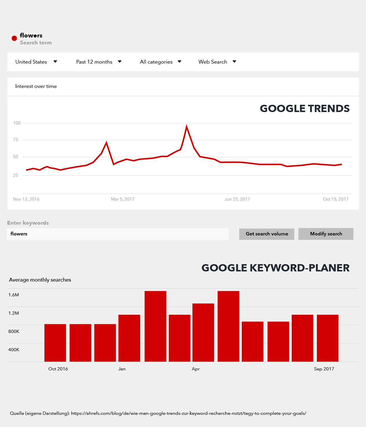 Wichtig ist hier der Faktor Zeit: Google erhebt Daten aus bisher getätigten Suchanfragen und leitet sowohl Trends als auch Prognosen davon ab. Und Prognosen entsprechen keinen tatsächlichen Zahlen von getätigten Suchanfragen durch die Nutzer. Dadurch entsteht ein großer Unterschied, den man bei der Betrachtung der Google Trends nicht außer Acht lassen darf.