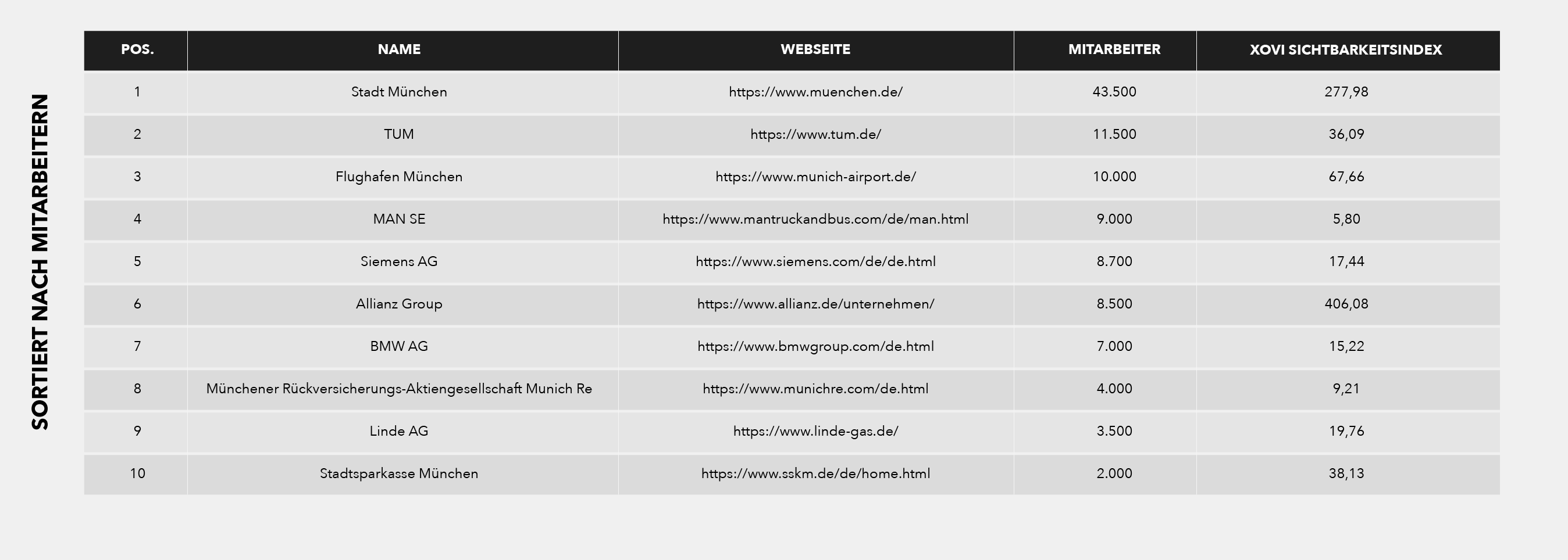Viele der Top-Unternehmen Münchens – von der Stadtverwaltung bis zur TUM – haben Tausende Beschäftigte. Trotzdem spiegeln sich diese Zahlen nicht automatisch in der digitalen Sichtbarkeit wider. Der XOVI-Sichtbarkeitsindex zeigt deutlich: Große Teams bedeuten nicht zwangsläufig große Reichweite. Als SEO-Agentur in München analysieren wir, wer digital wirklich punktet – und helfen genau da, wo die Sichtbarkeit zu schwach bleibt.