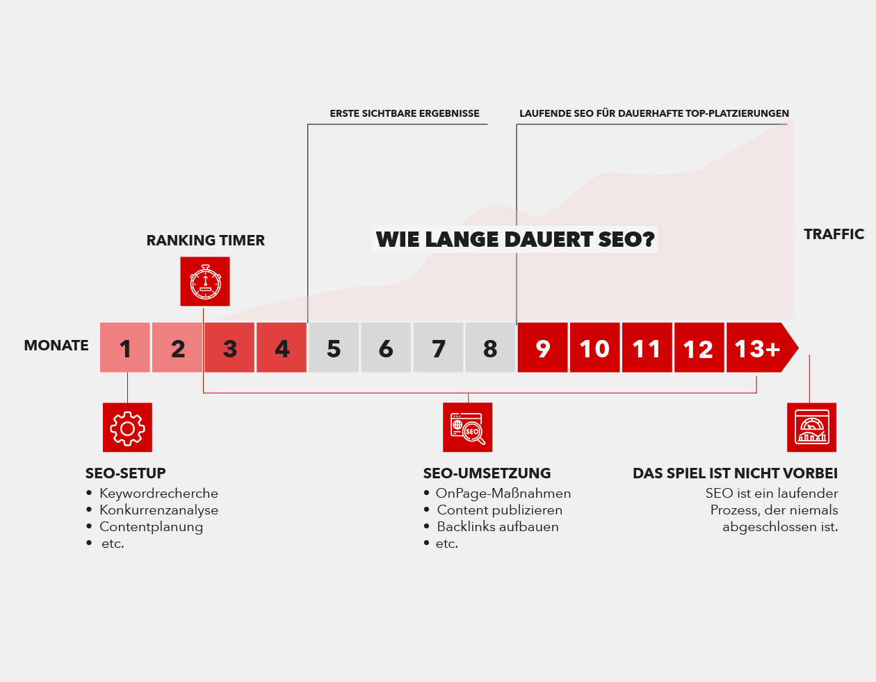 Erste Resultate siehst du oft nach 8–12 Wochen; weitere Ergebnisse zeigen sich normalerweise nach mehreren Monaten. Wettbewerb, Ausgangslage und Content-Tiefe bestimmen das Tempo. Faustregel: nach 4–6 Monaten ist die Richtung sichtbar – vorausgesetzt, Technik, Content und Offpage greifen sauber ineinander.