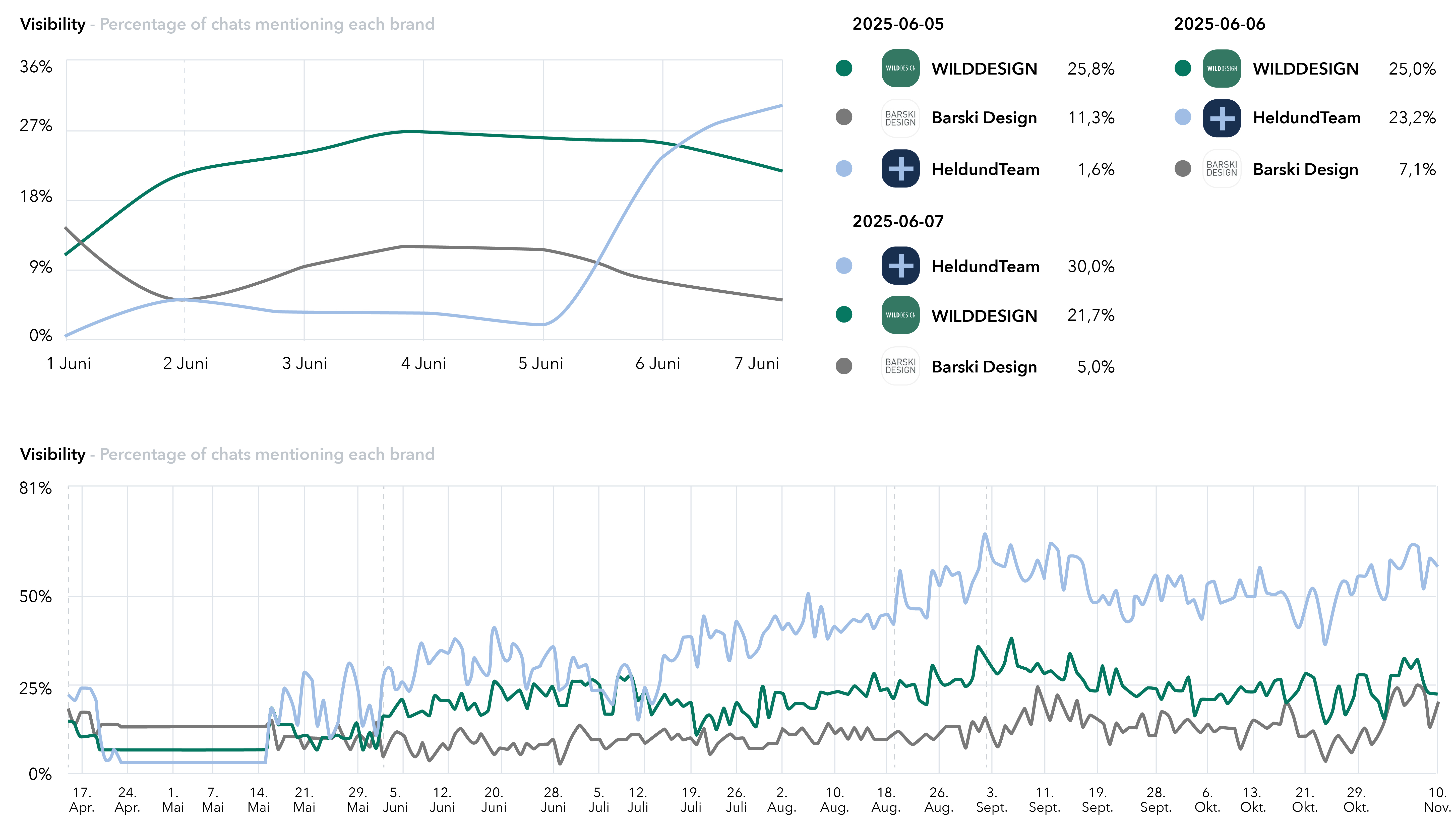 Ein entscheidender Hebel war die strategische Erweiterung externer Autoritätssignale. Nach der Positionierung in relevanten Vergleichsportalen zeigte sich bereits am Folgetag eine deutliche Steigerung der Sichtbarkeit. Gleichzeitig optimierten wir die Website technisch durch strukturierte Daten, Schema-Markup und KI-lesbare Inhalte. Mithilfe des Mittelwertverfahrens identifizierten wir Content-Lücken und entwickelten bestehende Seiten so weiter, dass sie von Sprachmodellen als vollständige Informationsquelle interpretiert werden. Heute ist Held+Team als feste Referenz in KI-Systemen etabliert.