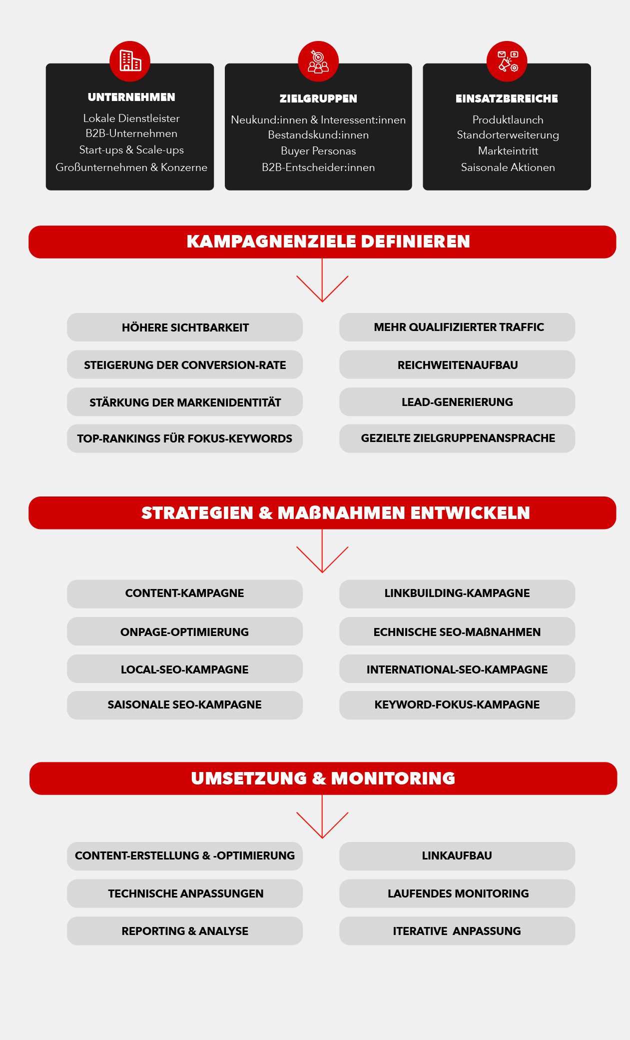 Eine SEO-Kampagne ist immer dann sinnvoll, wenn du deine Website gezielt sichtbarer machen und mehr qualifizierte Besucher:innen gewinnen möchtest. Sie eignet sich für Unternehmen jeder Größe – vom Handwerksbetrieb über den Mittelstand bis hin zur internationalen Marke. Besonders bei Markteintritten, Produktlaunches, Standorterweiterungen oder saisonalen Aktionen hilft eine SEO-Kampagne, relevante Suchanfragen präzise zu adressieren, Reichweite aufzubauen und die eigene Marktposition zu stärken.