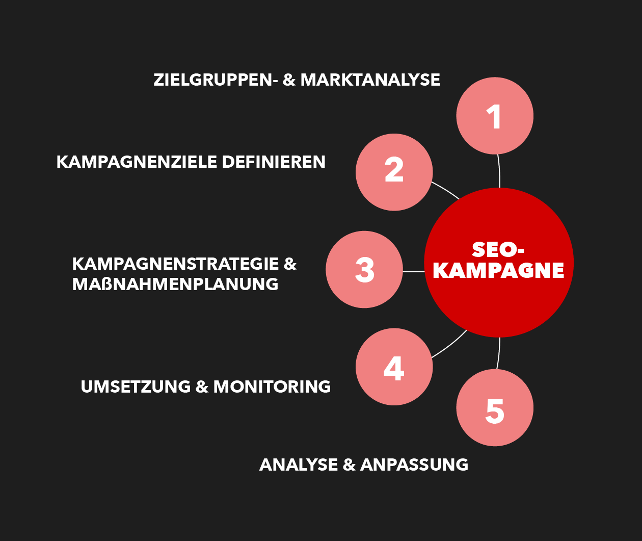 Eine SEO-Kampagne ist ein strukturierter Prozess, der verschiedene Maßnahmen kombiniert. Sie beginnt mit der Definition klarer Ziele, gefolgt von einer umfassenden Keyword- und Wettbewerbsanalyse. Darauf aufbauend werden Inhalte erstellt und optimiert, die technische Website-Struktur verbessert und hochwertige Backlinks aufgebaut. Jede Maßnahme wird laufend überwacht, analysiert und angepasst, um sicherzustellen, dass die Kampagne messbare Erfolge erzielt und flexibel auf Veränderungen wie Google-Updates oder Marktbewegungen reagiert.