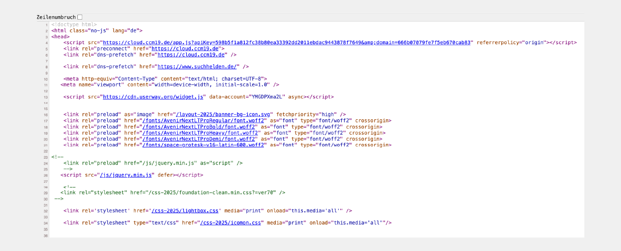 Mit Tools wie dem „Inspektor“ (F12 oder Rechtsklick → „Untersuchen“) siehst du das DOM – also den dynamisch gerenderten Code nach Ausführung aller Skripte. Beim Seitenquelltext hingegen handelt es sich um die Rohversion der HTML-Datei, so wie sie vom Server ausgeliefert wurde. Für SEO-Analysen ist dieser Ursprungszustand oft die verlässlichere Grundlage – etwa bei Canonical-Tags, hreflang oder Ladezeiten.